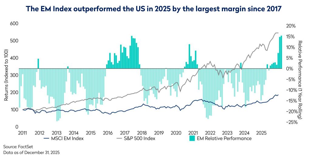 It has been rare to be able to write about the outperformance of Emerging Markets (EM) over the past 15 years, especially when comparing to the remarkable gains made by US indices over the same period. Nevertheless, the EM asset class has confounded the sceptics to record a gain of 34%, outperforming the S&P 500 by 15% and making 2025 one of the best years for EM relative performance since 2010. This outcome likely surprised many given the narrative of US exceptionalism and AI skepticism that dominated as we entered 2025, and the tariff-related shocks unleashed during the year. In the event, the EM recovery has been propelled by a combination of secular and cyclical earnings growth drivers. Additionally, fund data showed a rotation towards EM exposure, with investors attracted further by the persistent EM valuation discount. Whether this marks the beginning of a more sustained period of positive EM returns remains to be seen, but we find several encouraging trends and themes underlying 2025’s strong performance dynamics.
