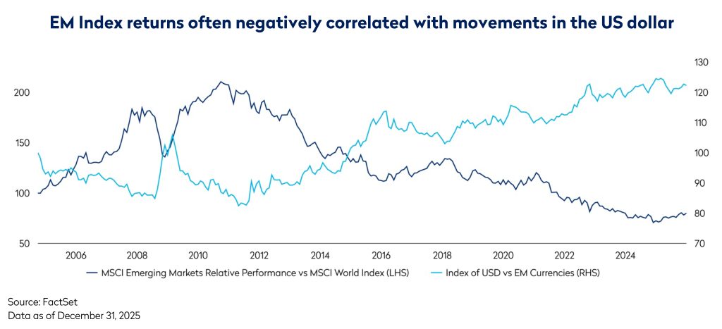 Third, and not to be underestimated, is the impact of US dollar weakness. Beyond the mechanical effect of boosted USD denominated returns, a softer dollar typically supports EM equities further through easing financial conditions, and greater risk appetite. Some EM governments and corporates borrow in dollars, so a weaker dollar reduces their debt-servicing burden and frees up domestic resources for investment and growth. At the same time, dollar weakness often coincides with expectations of lower US interest rates, prompting global investors to seek higher returns abroad. Finally, commodities, vital for many EM exporters, tend to strengthen when the dollar falls, boosting earnings and equity valuations. Latin America, which lacks significant listed AI exposure, was the biggest beneficiary of this dynamic, with the region returning 55% in 2025. Given President Trump’s vocal advocacy for deeper interest rate cuts, and the likelihood that he appoints a politically aligned Fed Chair in May, further US dollar weakness in 2026 appears realistic, which should continue to support EM performance.