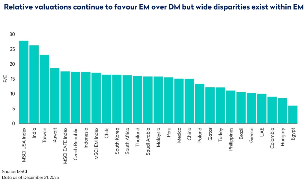Entering 2026, we continue to hold a constructive view on many of the key enabling factors that have driven strong returns during 2025. With AI capex projected to grow again and the value-up initiative in Korea ongoing, Taiwan and Korea could see ongoing support. Meanwhile, a more robust Chinese economic recovery that converts policy stimulus into genuine and broad-based profit growth would be an important driver given China’s benchmark weight and its central role in regional supply chains. Despite having re-rated during the year, most Emerging Markets continue to trade at a discount to developed markets, and particularly to the US. Combined with expectations of accommodative US monetary policy, this should support investment flows to EM markets and currencies provided there are no significant external shocks or arising issues that erode these strengths. With many such positive factors in play across the larger EMs, another good year is possible.