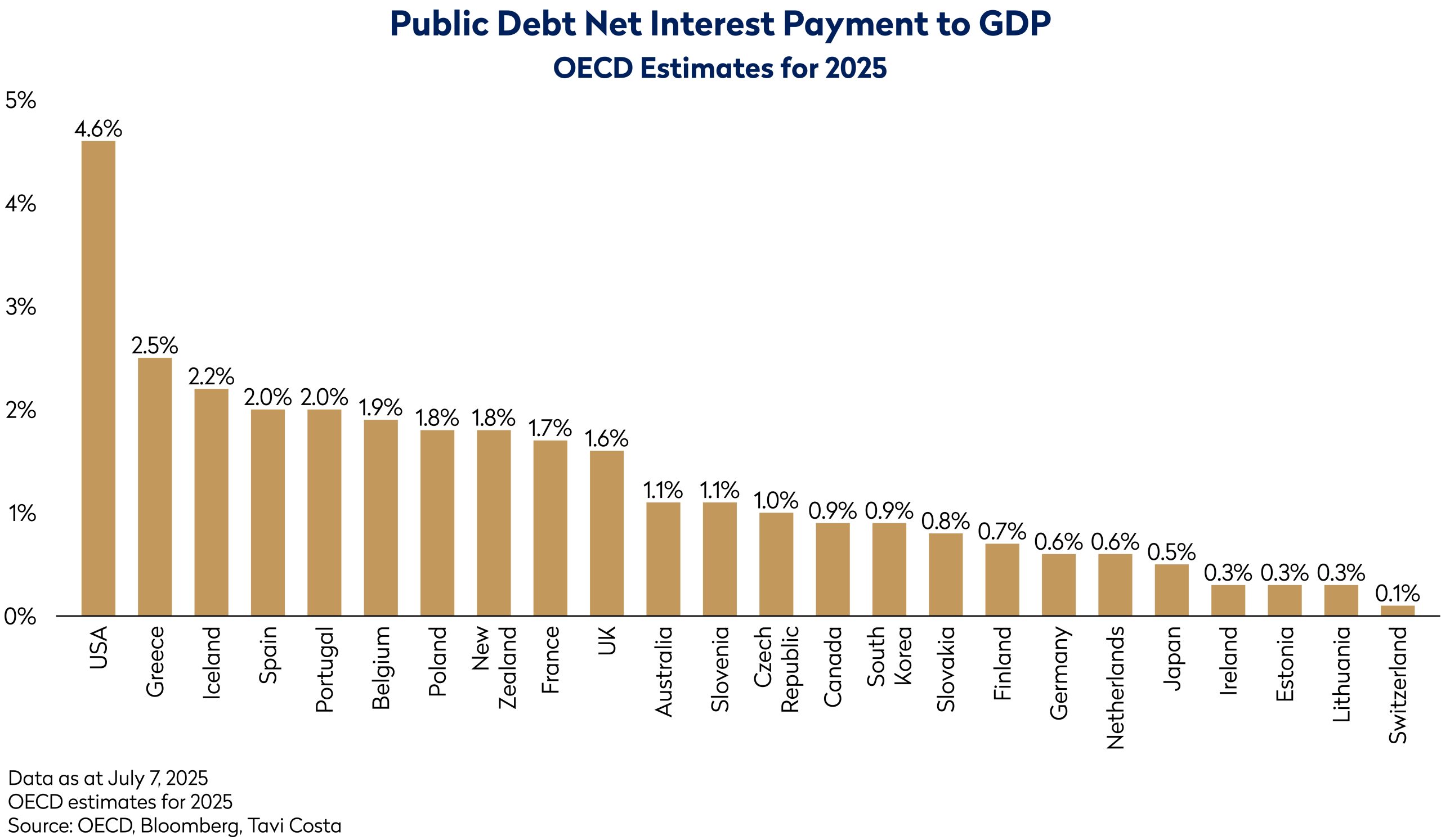 The U.S. faces growing challenges that undermine the reliability of Treasuries as the sole anchor of global portfolios. Net interest payments are projected to reach nearly 4.6% of GDP in 2025, the highest among developed peers, signaling an unprecedented fiscal strain on government finances.