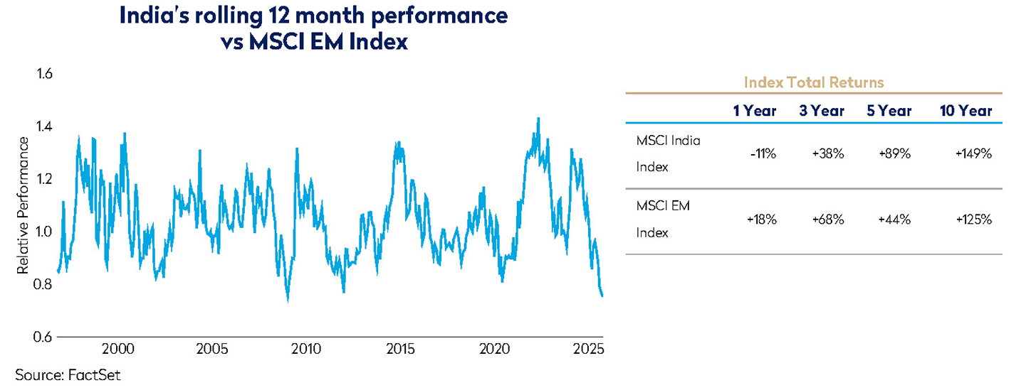 For much of the intervening period, investors retained a positive stance toward India. From October 2022 to September 2024, the equity market gained a further 56%, outperforming the MSCI EM Index by 10%. Our underweight stance was therefore a drag on relative performance through 2023 and much of 2024. Yet, since September 2024, India’s market has fallen by 11% in USD terms, while the EM Index rose 18%. This represented India’s worst year of underperformance since 1996 and means that, over three years, India has now underperformed EM by a not-insignificant 21%. Our underweight exposure thus evolved into a source of relative strength. The reasons for this shift cannot be traced to one event, but instead to a confluence of economic, structural, and valuation-related developments both within and outside India.