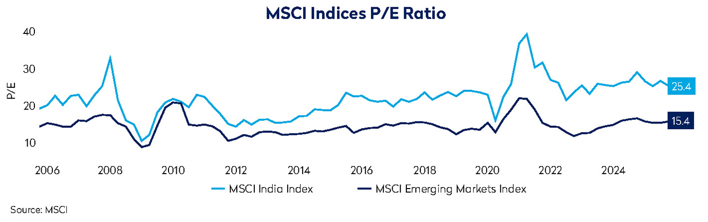 From an economic perspective, India has continued to deliver robust performance. Prime Minister Modi secured a third term in the 2024 general election, extending a period of political and policy stability. On the back of this, real GDP growth was 7.6% in 2023 and 9.2% in 2024, putting India on track to become the world’s third-largest economy within a decade. Inflation has trended lower, while budget and current account deficits have remained contained. Institutions have generally managed risks effectively, though the central bank has faced criticism for excessive caution. High interest rates and tighter rules on unsecured lending were blamed for softer consumption and earnings growth in late 2024. Even so, India’s macroeconomic performance has remained impressive compared to global peers.