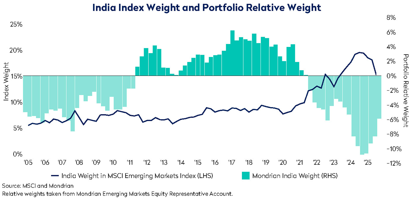 In summary, India continues to present a conundrum for value investors, just as it did in 2022. India retains an attractive long-term outlook, with a growing economy, deeper markets, and improving breadth of participation. The country should offer substantial investment opportunities over time, but valuations remain a persistent obstacle. For this reason, we remain cautious at the aggregate market level and maintain an underweight stance. Still, we have selectively added exposure where attractive entry points emerged, including new positions in Hero Motocorp and Infosys. This has nudged our total exposure higher to above 9%, narrowing our underweight to approximately 6% compared with 11% a year earlier. This level of positioning is consistent with where we stood three years ago when the benchmark weight and valuation ratios were almost identical to today’s.