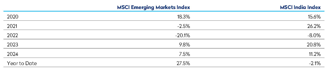 It has been three years since India last formed the theme of our quarterly outlook. At that time, the country had enjoyed a long stretch of strong equity market performance, comfortably outpacing most global indices and securing the second-largest weighting in the MSCI Emerging Markets (EM) index. This rally reflected India’s solid economic fundamentals and political stability, but it was also driven by an expansion in valuation multiples. India therefore represented a conundrum for us as value investors; while we recognized many positive features, concerns over stretched valuations led us to adopt a significant underweight position. Three years on, it felt an appropriate time to revisit India’s progress and our positioning.